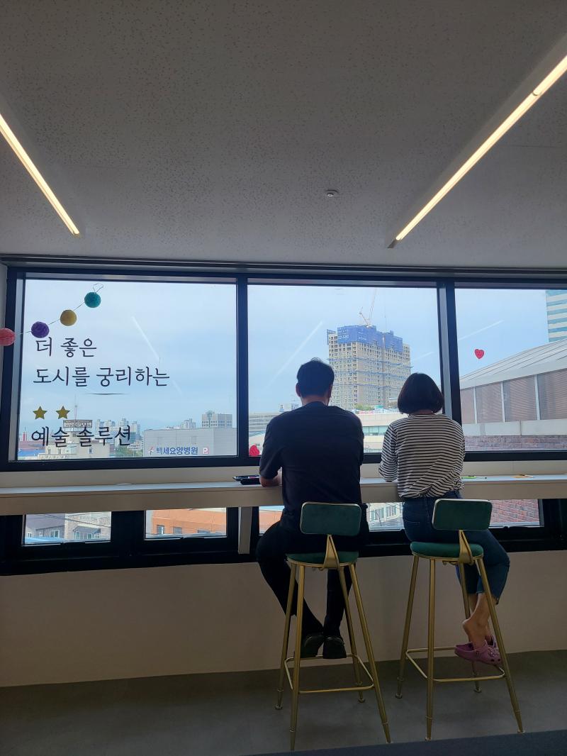 드디어 ‘사람이 모인 랩’이 구성되었고, 재단 안에 모일 ‘공간으로서의 랩’이 구축되었다. 유형의 공간인 랩은 창의랩이 잘 이루어지기 위해서 굉장히 중요한 요소이다. 아무리 온라인이 편해졌고 다양한 통신수단이 발달했다고 해도, 통신미디어들은 목적지향적이다. 목적 이외의 것들이 들어오면 피곤하다. 그런데 다르게 해보려면 목적을 넘어서서 같이 있는 시간이 중요하다. 함께 공존하는 시간에 자기 공부도 하고 수다도 떨고 투덜거리기도 하고 깔깔 웃기도 하면서 어느 틈에 신뢰가 쌓이고 관계가 만들어진다. 새로운 시대에 중요하다고 그토록 강조하는 협력의 파트너십은 머리로 하는 것이 아니라, 시간으로 하는 것이다. 공간으로서의 랩은 참여하는 사람들의 시간이 쌓이는 곳이면서, 몰입과 논의가 일어나는 비정형의 공간일 때 작동을 시작한다. 광주 창의예술교육랩실에는 도시를 향한 멋진 전망과 예쁜 로고, 창의랩의 질문들이 공간을 채웠다. 아마도 사람들의 발걸음으로 더욱 톡톡하게 채워질 것이라는 생각이 들었다.