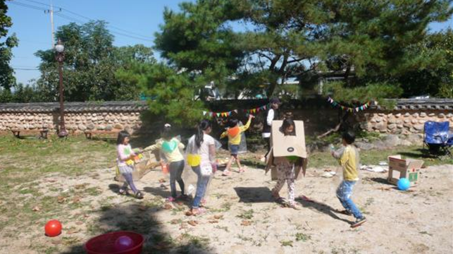 가을하면 떠오르는 ‘한가위 운동회’도 서창마을에서 하면 특별하다. 재료를 바닥에 펼쳐두면 아이들 스스로 같이 협동해서 놀이를 하거나 작품을 만든다. 종이 박스로 배를 만들기도 하고, 어떤 친구는 종이박스를 입고 돌아다닌다. 나뭇잎과 모래를 쌓아 에펠탑을 만들기도 하고, 누가 많이 쌓아 올려놓는지 시합을 하기도 한다.