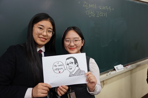 칠판위에는 ‘릴레이 노래가사 만화 그리기’ 라고 쓰여 있다. 말 그대로 가사의 한 구절씩 한 학생이 맡아 가사와 어울리는 그림을 그려 넣으면 된다. 조대호 강사가 준비해 온 가요는 김범수의 ‘사랑의 시작은 고백에서부터’이다. 총 26개의 문단으로 나눠진 가사 중에 본인의 마음에 드는 가사를 학생들이 직접 선택한다. 어떤 구절은 여러 명의 학생들이 한꺼번에 지원하기도 한다. ‘사랑’이라는 단어가 들어가 있는 구절이 특히 인기가 많다. 함께 하는 수업이지만 개인의 작업이기도 하기에 노래가사를 선택하는 학생들의 모습이 신중하다.