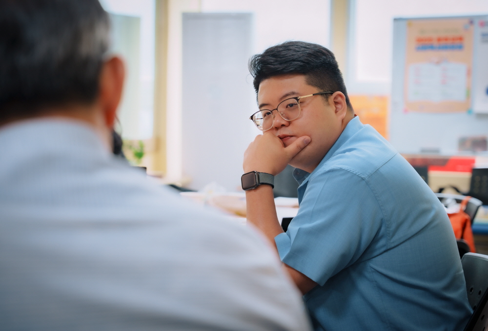 '문화예술교육이 뭘까. 내가 하던 것은 무엇이었을까. ' 차이를 새삼 고민하며 오월문예연구소의 이야기에 녹아들고있는 박재형 팀장 ⓒ청춘기획 라이브온