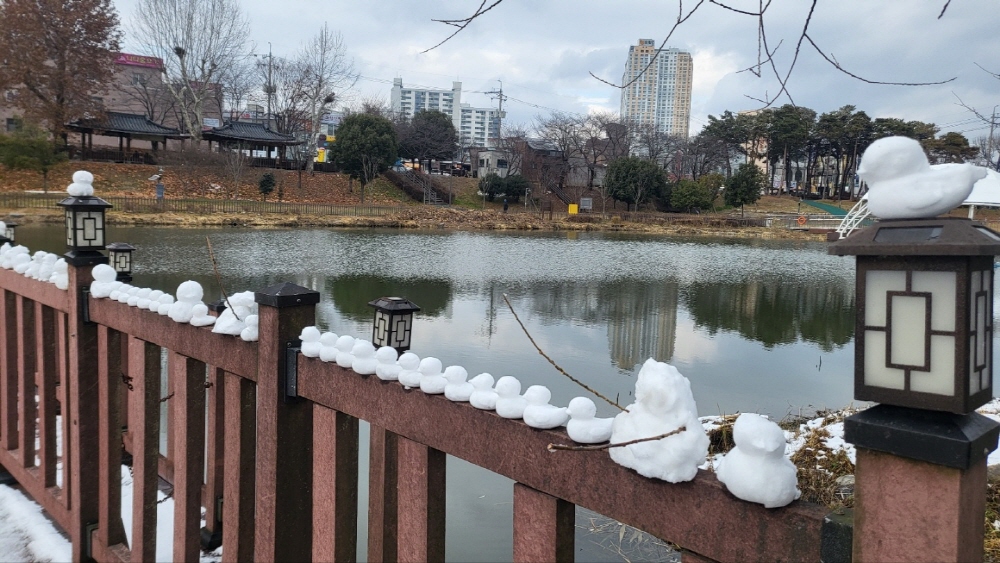 해마다 눈 오는 날이면 아이들이 만들어 놓은 귀여운 눈 오리를 보며 “나도 만들어보고 싶다”라고 지나가듯 말하곤 했다. 그런데 작년에 애매하게 첫눈이 오는데도 우리의 단톡방은 번개 미팅을 하자며 난리가 났다. 양산호수공원에 집결한 우리는 공수해 온 다양한 틀로 한가득 눈 오리를 찍어냈다. 동네 꼬마와 산책 나온 가족들까지 어느새 합세하여 눈 오리, 눈사람, 눈 거북을 만들었고 공원은 순간 조각공원이 되었다.