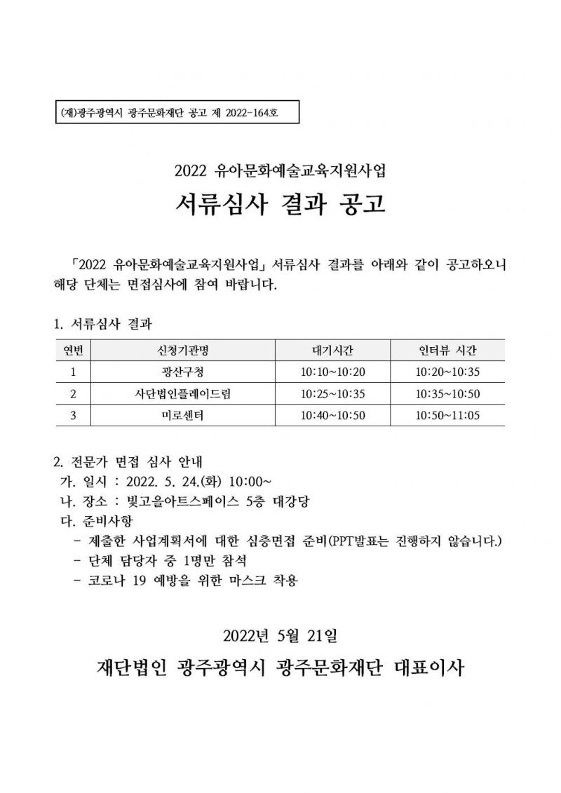 2022유아문화예술교육지원사업 재공모 서류심사 결과 공고