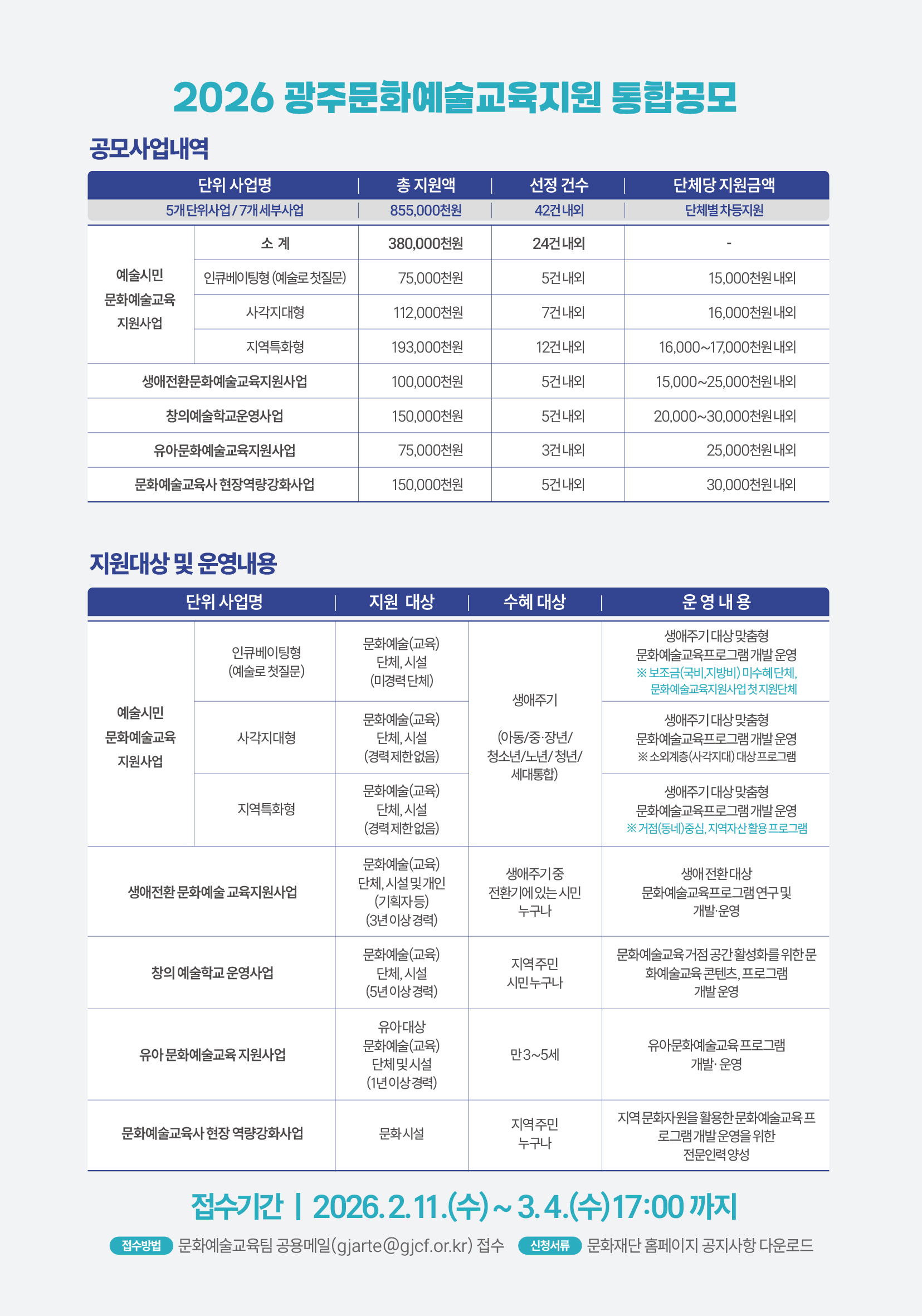 - [붙임1] 2026년도 광주문화예술교육지원사업 통합공모 안내 (공통).hwp [size : 147.5 KB] [다운로드 : 30]