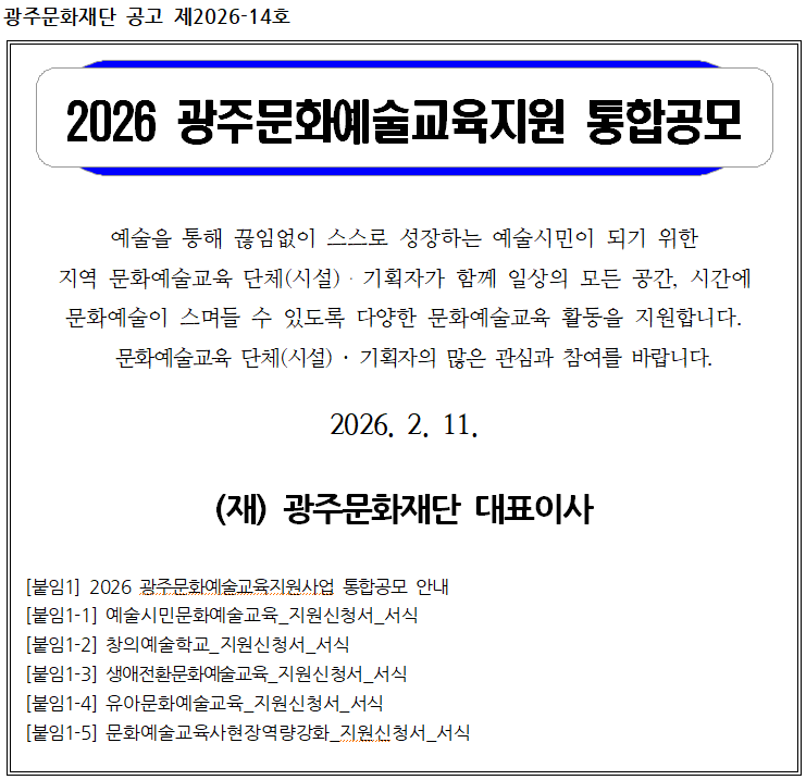 - 2026 광주문화예술교육지원사업 통합공모 (안내책자).pdf [size : 1.0 MB] [다운로드 : 52]