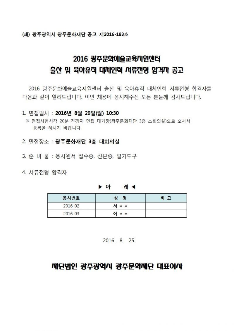 2016 광주문화예술교육지원센터 출산 및 육아휴직 대체인력 최종 합격자 공고
