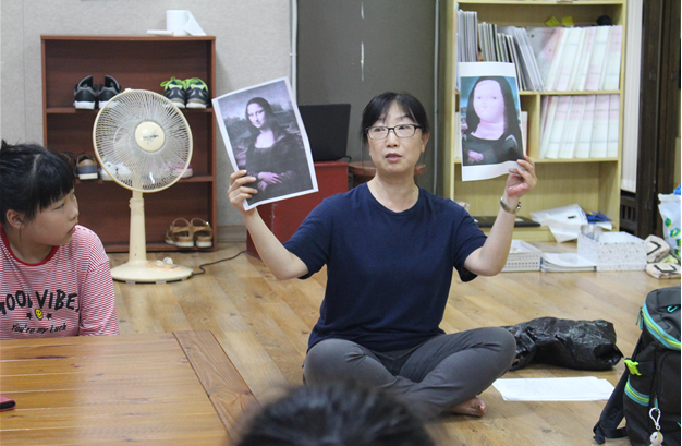 한명은 서 있고 한 명은 의자에 앉아있는 그림을 통해서 이야기를 만들어보자. 두 모둠으로 나누어서 각자의 의견을 조율해서 한 가지 큰 이야기를 발표한다. 돈으로 얽힌 부모 자식간의 싸움으로 발전된 모둠, 부모의 죽음을 알고 슬퍼하는 장면을 이야기하는 모둠 등 이야기를 전개시켜 나갔다.