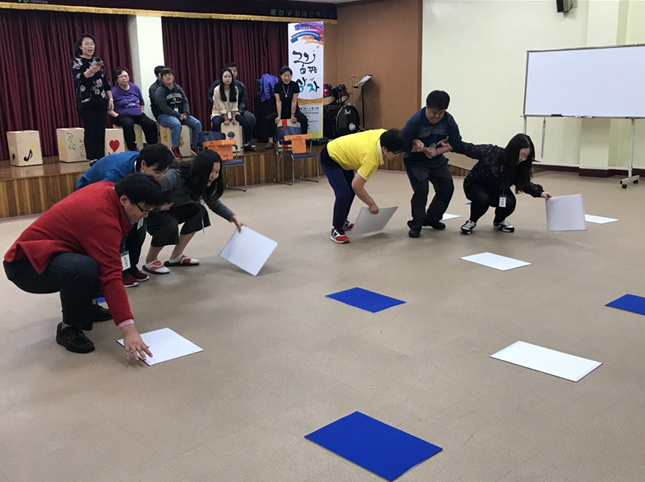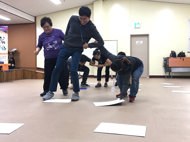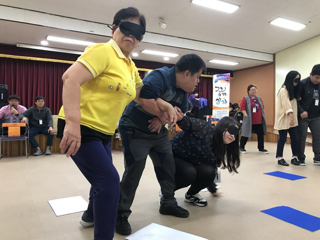 비장애인과 장애인 사이의 ‘소통’은 여기서도 일어난다. 계속해서 뒤로 가라는 지시를 하는 뇌역할이 있다. 이 사람이 원한 것은 앞으로 가자는 의도였다. 그러나 한 번의 게임으로는 뒤로 가봤자 색판넬이 없는 것이다. 그 뒤로 팀원이 그 의도를 알아차린다. 서로만의 ‘소통’을 통해서 알아가는 순간이다.