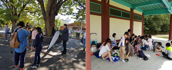 A. 저희 프로그램은 1기, 2기로 나눠서 두 차례 진행했어요. 처음 1기 때는 아이들이 많아서 여기 앞 주차장에서부터 시작해서 근처 동네 공원, 마을 축제 이런 식으로 행동반경을 넓혀갔어요. 그러다보니 2기 때는 가족 참여자들이 많아서 경상도 함양까지 가서 사진을 찍었어요. 프로그램 참여자들의 형태에 따라서 그에 맞는 욕구를 맞춰주는 것들이 저희가 할 일이라고 생각해요. 그러다보면 정해놓은 커리큘럼과는 다소 벗어나기도 하지만 참여자들의 특성과 요구에 맞게 유연하게 변화를 줄 수 있어야 합니다. 저희가 큰 틀을 제공하고 그 안에서 참여자들이 놀 수 있도록 윤활유 역할을 하는 것이 저희가 추구하는 문화예술교육입니다.