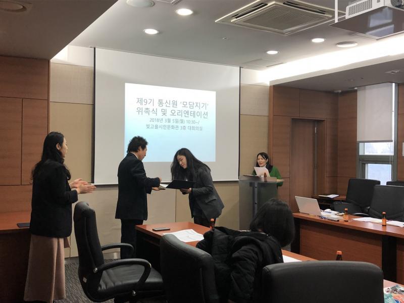 우선 전체적인 센터 소개와 모담지기의 역할에 대해 소개받았다. 평소 글쓰기에 관심 있는 통신원들이 다수였지만, 그렇지 않더라도 상세하고 친절한 가이드라인을 통해 모담지기의 비전과 방향성을 명확히 알 수 있었다. 다음으로는 김홍석 실장의 위촉장 수여가 진행되었는데, 저마다 이름이 새겨진 임명장을 받으면서 문화예술교육 현장을 소개하는 역할에 무게감을 느끼는 듯했다. 따뜻한 조언과 격려를 통해 앞으로의 막연했던 활동에 대한 두려움은 떨치고, 자신감을 얻는 시간이었다.
