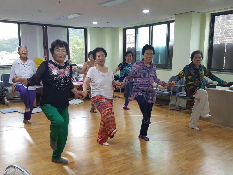 이내, 자유로움이라는 감정이 지배적인 분위기를 조성하였다. 그리고, ‘학’을 온몸으로 표현해보는 시간을 가졌다. ‘하나, 둘, 셋! ’ 구호가 떨어짐과 동시에 모든 어르신이 군무를 맞추듯 한쪽 다리를 일체 들기 시작하였다. 중심 잡기가 어려워지자 옆 어르신의 손을 맞잡고 서로 의지하며 온몸으로 자유로움을 표현하였다.