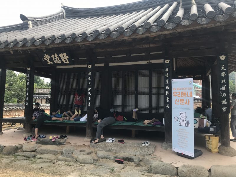 A. 처음 제가 의도했던 것과는 다르게 흘러가고 있는 것 같아요. (웃음) 아이들이 안 따라 와줄 때도 있고 지금 날도 더우니까요. 그런데 저번에 재단 선생님께서 너무 결과에 치중하지 말라고 말씀해주셨어요. 보이는 결과에 신경 쓰지 말고 과정에 좀 더 집중해서 활동을 이어나갔으면 좋겠다고 해주셔서 부담이 없어졌죠. 여름은 쉬어가는 타임이라고 생각하고 있고, 하반기부터 본격적인 시작 단계로 계획하고 있어요. 가족들을 소개하는 소개문이나 오늘과 같이 마을 문화유산을 견학하고 글을 쓴 것을 실을 것 같아요. 다다음 주에나 1호 소식지가 나올 것 같아요.