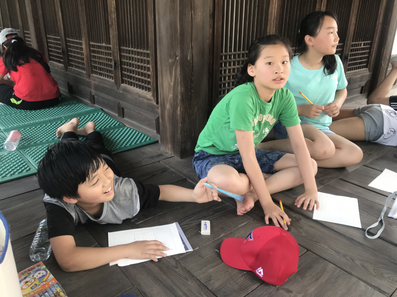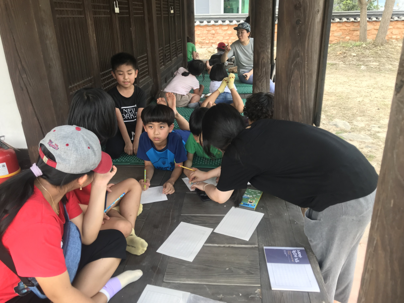 ▲야은당에서 탐험일지를 쓰고 있는 모습 / 머리를 맞대고 글을 쓰는 아이들