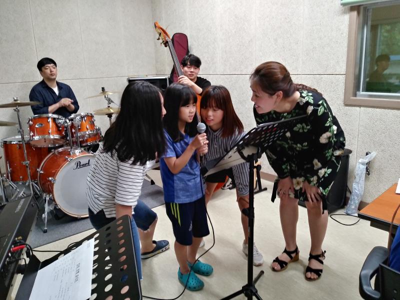 이렇게 열심히 서로 도와가며 가사를 만들고 함께 노래를 부르자 엄청난 일이 일어났다. 수업시간 내내 유독 부끄러움을 타서 자리에도 앉지 못하고 자꾸 목공과 시소 선생님들 뒤로 숨어들던 참가자가 부끄러움을 던지고 당당히 무대에 서서 노래를 부르겠다고 손을 번쩍 들었다. 아직은 어리지만 목공시간에는 똑 부러지는 그녀를 시작으로 참여자들이 직접 개사한 곡을 돌아가며 부르고 녹음하는 시간이 이어졌다.