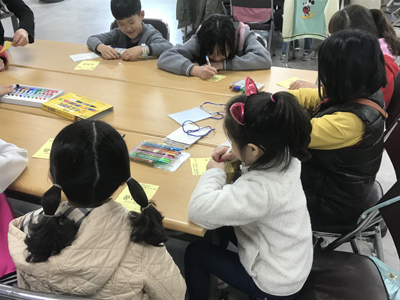 프로그램 설명이 끝나고 간식을 먹은 뒤 공연장에는 아이들만 남아 수업이 계속됐다. 부모님이 떠나고 ‘엄마가 가라고 해서 온 게 아니라 내가 오고 싶어서 온 사람 손!’이라는 선생님의 질문에 손을 번쩍 드는 아이들. 이름과 학년을 소개하고 자신을 표현하는 단어와 그림으로 각자의 이름표를 꾸몄다. 버스킹 공연에서 엉망진창 오케스트라를 알릴 깃발도 제작했다. 다양한 악기 그림을 오려 깃발에 붙이고, 색을 칠해 깃발을 완성했다. 앞으로 있을 여러 차례의 공연과 버스킹을 함께할 깃발이었다.
