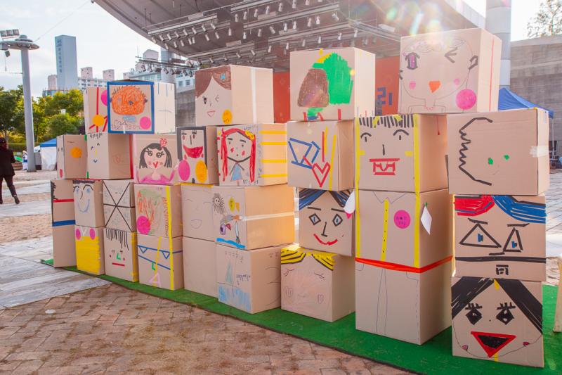 전시·체험을 잠깐 돌아보는 사이 순식간에 공연 1부가 끝이 나있었다. 날라리들의 개막식은 호동이 풍물패와 얼씨구 할 때가 제일 좋아!를 시작으로 한춤예술단_대금, 부채춤, 광주어린이요들합창단_하나를 꿈꾸는 아이들의 노래, 극단 토박이_요즘 애들(뮤지컬)의 순으로 공연 1부가 진행 되었다. 뒤이어 주제체험이 이어졌는데, 박스를 이용해서 자화상을 그리는 체험이다. 무대로 나간 아이들이 박스에 다양한 재료와 생각들로 그려넣은 자화상을 관람석 뒤에 전시해 놓으면서 마무리 되었다.