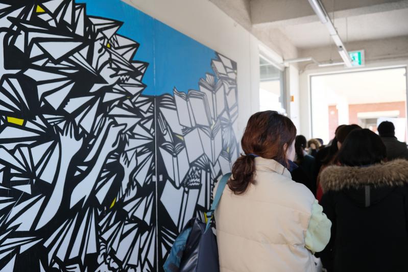 프로그램을 기획하고 운영하던 선생님들이 오늘만큼은 직접 프로그램을 경험하는 참여자가 되어 은반지와 가죽 지갑을 만들고 소행성에서의 하루를 즐긴다. 체험 후에는 공간을 둘러보며 문화예술 교육의 중요성을 재확인하는 시간을 가졌다. 건물과 건물 사이를 지나는 길, 커다란 작품이 벽면을 장식하고 있다.