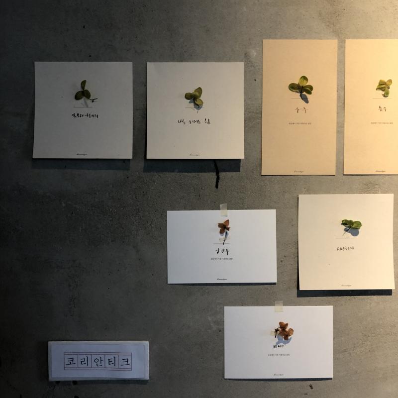 한국적인 미를 담아낸 글씨를 통해 자신만의 감성을 담아낼 수 있도록 이끌어주는 코리안티크는 성별, 나이에 관계없이 우리말을 사랑하고 아름다운 글자를 적고자하는 분들을 위한 동아리이다. 덕분에 코리안티크의 작품들은 한글 속에 숨겨진 아름다움을 느끼게 해준다. 이번 지원사업을 통해 회원 각자 아마추어 캘리그라피 작가로서 순우리말 엽서를 제작하여 한글의 아름다움과 현대의 감성을 합친 캘리그라피를 선보이고자 한다. 코리안티크의 이번 교육은 드로잉 기법배우기부터 시작해 자음과 모음쓰기, 글자의 구도잡기, 문장 이어적기, 글자의 강약조절하기, 순우리말엽서 제작, 셀링왁스를 사용한 딥펜 적기 마지막 전시 작품 구도 잡기로 마무리되었다. 코리안티크는 일률적인 캘리그라피가 아닌 동아리 회원 각자의 개성을 담은 작품들이 전시에 가득했고, 한시적으로 끝나는 전시회가 아니라 이를 통해 더 많은 시민들이 순우리말 캘리그라피에 관심을 가지고, 많은 사람들이 함께 소통할 수 있는 동아리로 확장하고 싶다고 한다.
