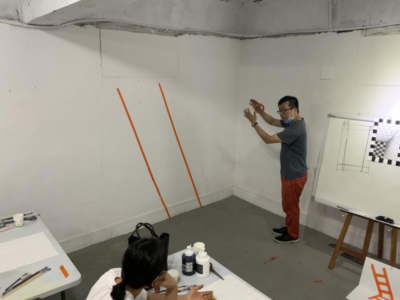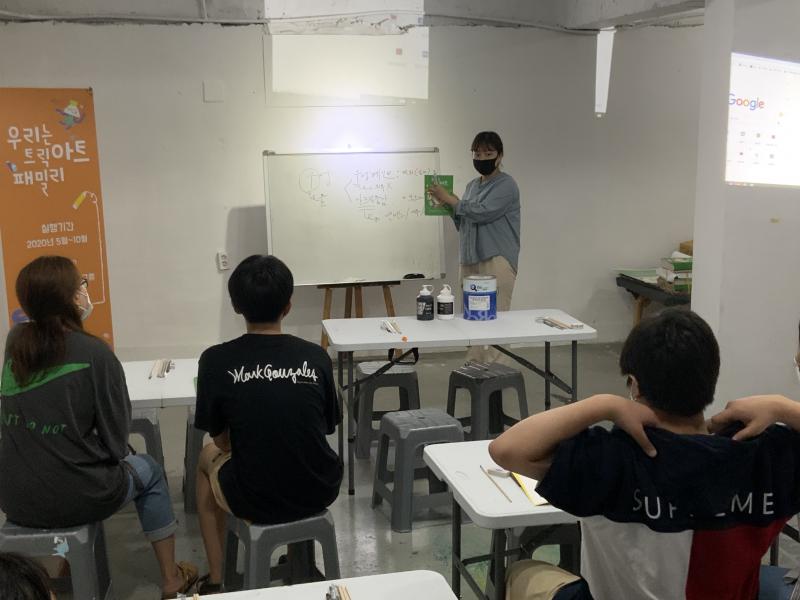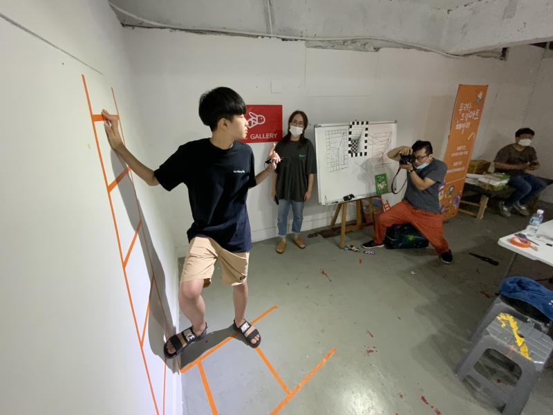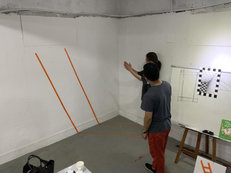 A. 저희가 직접 제작한 책자에 이론들이 정리가 되어있어요. 그래서 1회 차에는 이론들을 이해할 수 있게끔 도표랑 같이 작업을 해서 이론수업진행을 하였고요. 2회 차는 재료에 대한 교육으로 다양한 재료를 상황에 맞게 어떻게 사용하는지에 대한 교육을 준비했어요. 그러면서 간단한 스케치와 붓 칠 그리고 테이핑 작업을 통해 실내에서 트릭아트를 해보는 체험을 진행했습니다.