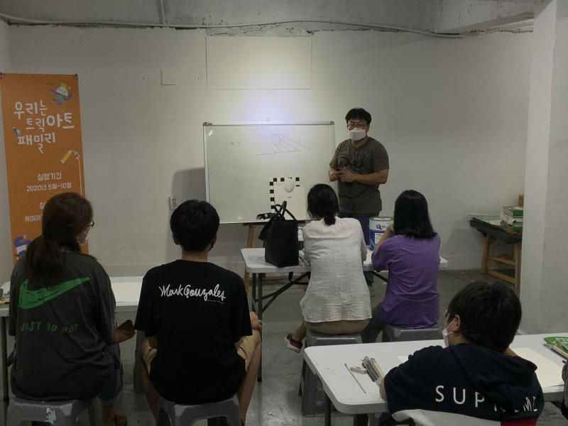 트릭아트 재료에 대한 이론수업이 끝나고 직접 트릭아트를 만들어보는 시간을 가졌다. 처음 시작은 정혜진 작가(강사)의 명암의 차이를 이용한 ‘공간 만들기’수업을 들으며 참여자들이 직접 그려보는 시간이었다.