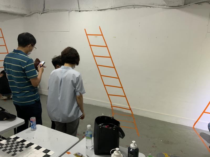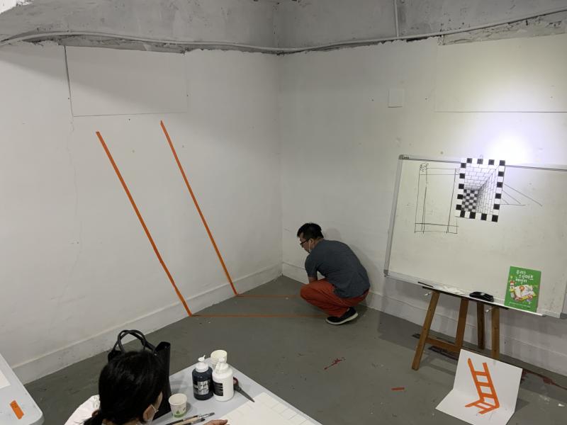 종이에 간단한 트릭아트를 그려보았다면 이제 벽을 활용한 조금 더 큰 트릭아트를 만들어보는 시간이다. 벽과 바닥에 선을 이용하여 사다리를 만드는 것으로 시점을 활용하여 착시를 준 ‘오르는 사다리’를 만드는 것이다.