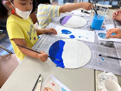 동그란 캔버스에 연필을 이용해 각자 여러 파도를 그려갔다. 한 친구는 구불구불한 파도를 다른 친구는 금방이라도 배를 뒤집을 거 같은 성난 파도를 그린 후 물감과 붓을 이용해 시원한 파란색 바다와 몽환적인 보라색 바다를 그려나갔다. 물감을 듬뿍 캔버스에 올리기, 흩뿌리기, 그라데이션 등 다양한 미술 기법을 선생님의 도움을 통해 표현하고 부모님에겐 바다에 관련한 여러 가지를 물어보았다. ‘저번 여름에 간 바다는 어디지?’, ‘따뜻한 바다는 없어?’ 등등 아이들은 질문을 통해 자신만의 바다를 완성해 나갔다.