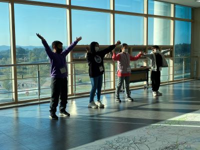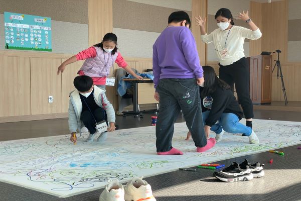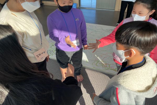 프로그램이 진행되는 교육실에 들어서자마자 바닥에 커다랗게 깔린 하얀 켄트지가 눈에 띄었다. 그리고 다양한 색깔의 마카를 이용해 신나는 음악과 함께 자유롭게 물길 드로잉을 표현하였다. 처음에는 너무 넓은 하얀 켄트지가 막막한 듯 다가왔지만 앉아서 정적으로 그리는 게 아닌 몸을 이리저리로 이동하면서 그리는 데에 아이들은 곧 흥미를 느끼고 친구들과 함께 자유롭게 그려나갔다. 그리고 그려진 물길 드로잉 위를 선생님과 아이들이 함께 걷는 모습이 영산강을 건너는 듯한 모습을 그려내었다.