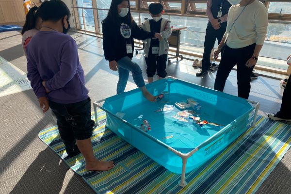 이제 영산강을 청소할 어린이 청소부가 되어볼 시간이다. 아이들은 3인 1조로 한 명은 눈을 감고 나머지 두 명은 눈을 감은 친구를 수조 앞까지 무사히 이동할 수 있도록 도와준다. 그리고 눈을 감고 있는 친구의 발에 끈을 아이들과 선생님들의 ‘왼쪽’, ‘오른쪽’, ‘아니 뒤로’ 등의 소리를 듣고 발을 움직여 쓰레기를 건져 올리면 성공! 실제 영산강과 비슷한 환경으로 꾸며놓은 수조 위에 둥둥 떠다니는 쓰레기들을 건져 더러워진 강을 청소하고 분리수거까지 해보는 시간으로 준비되었다. 이제 가위바위보로 순서도 정해졌으니 이제 본격적으로 청소를 해보자.