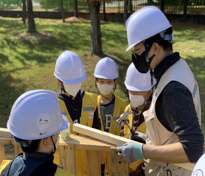 A. 아이들은 임무를 줘야 해요. 그래서 시범을 보여주고 이런 형식으로 하면 된다고 보여주면 잘 따라 해 줘요. 아이들은 기계를 사용하지 못하기 때문에 아이들이 못과 망치로 다 조립할 수 있게끔 구성을 디자인했어요.