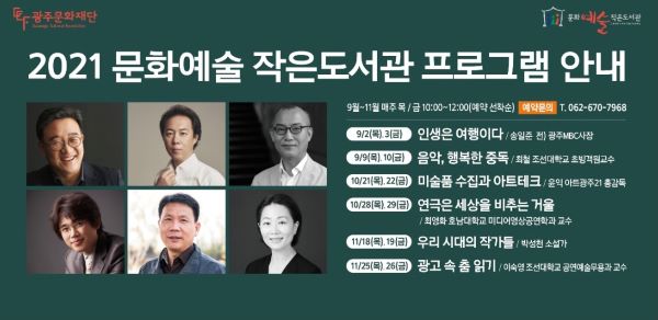 이젠 마스크를 쓰는 게 익숙한 일상 속, 우리는 포스트 코로나 시대에 적응하고 개인주의가 확산된 시대에 살아가고 있다. 이와 동시에 최근 들어 인간의 사상 및 문화연구와 관련된 학문인 인문학이 주목받게 되었다. 그리고 이것을 기반으로 인간의 가치와 자기표현 방식에 대한 개념이 떠올랐다. 이에 발맞추어 광주문화재단의 문화예술 작은도서관에서는 지역주민을 대상으로 총 여섯 강좌를 약 12회에 걸쳐 인문학 강좌를 진행하였다. 총 여섯 개의 콘텐츠로 이루어진 이번 강좌는 여행, 음악, 미술품수집과 아크테크, 연극, 소설, 공연, 무용 등 문화예술 분야를 중점으로 다방면으로 구성되었다. 각 분야의 전문가를 초빙하여 지역 주민들과 지친 일상 속 흥미로운 프로그램들을 통해 환기시키는 시간을 가졌다.