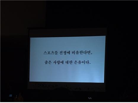 스포츠를 전쟁에 비유한다면, 춤은 사랑에 대한 은유라는 말로 워크숍은 시작되었다. 이는 즉 스포츠는 결과 성취에 따른 보상을 주나 춤은 참여에 초점을 맞춘다는 것이다. 무엇보다 춤이 가지는 큰 가치는 ‘내가 누구인지를 알 수 있게 한다는 것’이다.