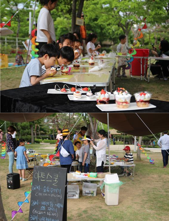 아트피크닉의 또 다른 장점은 예술을 단순히 보기만 하는 것이 아니라 아이들이 직접 예술 관련 프로그램에 참여해서 체험해 볼 수 있는 프로그램들이 많이 있다는 것이다. ‘아트 스쿨’의 경우 내가 좋아하는 소품들을 캐릭터들로 꾸며본다던가, 바람개비와 선캡을 내 손으로 만들어보는 프로그램들이 진행되고 있었으며 ‘직업체험 프로그램’에서는 푸드스타일리스트 직업 체험으로 아이들이 컵케익에 원하는 토핑을 얻어서 음식을 꾸며보고 먹어보는 체험이 진행되고 있었다. 네일아트, 캐리커쳐 그리기, 그림 심리치료 프로그램 등 예술과 관련있는 ‘ART 특성 공방촌’들이 꾸며져 있다.