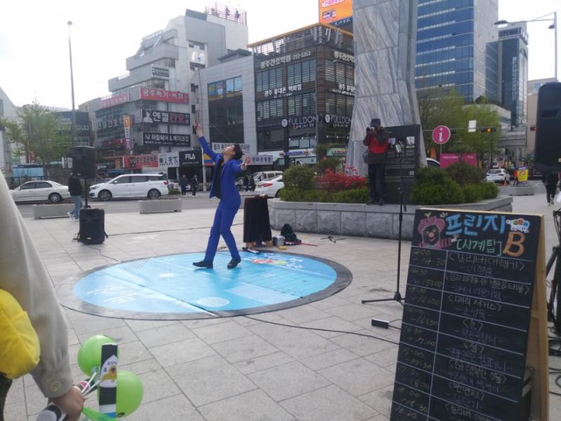 총 18개 팀의 맛보기 무대인 프리뷰쇼를 지켜보다가 추위도 떨칠 겸 몸을 움직여 518민주광장 방향으로 향했다. 금남로 거리에 비해 한산한 느낌이었지만 ‘매직 서커스’의 공연자는 ‘고난도’의 기술을 선보이며 관객들의 환호와 박수를 받고 있었다. 입을 벌리고 바라보다 그의 공연이 끝나고 분수대로 향하니 분수대 주변에는 미술을 중심으로 체험행사가 진행 중이었다. 그러고 보니 프린지의 포스터가 아이들이 그린 그림으로 만들어졌다고 들었는데, 올해도 프린지 키즈 작가를 찾는 코너가 진행되고 있었다.