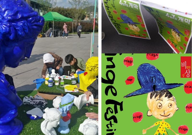 ▲소형 석고상을 채색하는 체험을 하고 있는 아이들과 광주프린지페스티벌의 포스터