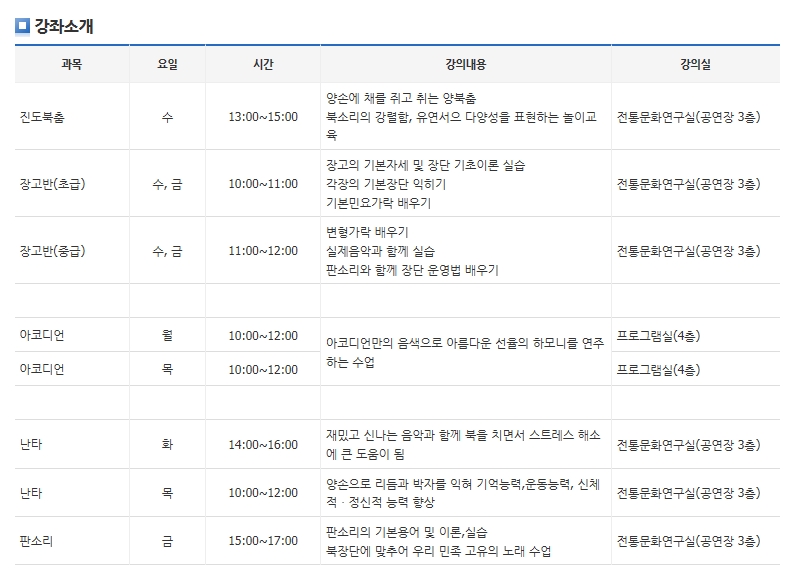 A.저희가 문화교실도 많이 운영하고 있는데, 문화교실에서 중점적으로 하는 것은 생활문화 센터나 청소년 수련관에서 할 수 없는 사업으로 문화원 고유의 전통문화를 알릴 수 있는 장고교실이나 판소리, 난타, 진도북춤 등 다른 곳에서 일반적으로 잘 지원하지 않는 사업들을 하고 있어요. 저희는 전통을 지키는 것이 주목적이기 때문에 앞서 말한 프로그램을 주로 운영하고 있으나 전통만을 고수할 수 없기 때문에 주민들이 선호하는 악기로 아코디언이나 하모니카, 오카리나, 우크렐레 등과 같은 음악프로그램을 넣어서 주민들의 참여를 높이고 문화원을 활성화 시키는 프로그램을 하고 있어요. 그리고 전통문화 쪽으로는 한번 시작하신 분들 중에서 꾸준히 많은 분들이 10년 이상 프로그램에 참여하고 계세요.