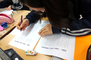 칠판위에는 ‘릴레이 노래가사 만화 그리기’ 라고 쓰여 있다. 말 그대로 가사의 한 구절씩 한 학생이 맡아 가사와 어울리는 그림을 그려 넣으면 된다. 조대호 강사가 준비해 온 가요는 김범수의 ‘사랑의 시작은 고백에서부터’이다. 총 26개의 문단으로 나눠진 가사 중에 본인의 마음에 드는 가사를 학생들이 직접 선택한다. 어떤 구절은 여러 명의 학생들이 한꺼번에 지원하기도 한다. ‘사랑’이라는 단어가 들어가 있는 구절이 특히 인기가 많다. 함께 하는 수업이지만 개인의 작업이기도 하기에 노래가사를 선택하는 학생들의 모습이 신중하다.