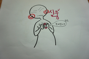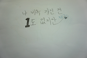 그림 하나하나 나름의 의미가 있고 창의적이라 감탄이 절로 나온다. ‘사랑은 내게 상처뿐이라’ 라는 그림에서는 한 소녀가 심장에 화살을 맞고 울고 있다. 주위의 배경도 소녀의 마음을 대변해 주듯 어둡다. 누군가 “내 마음이 더 아파” 라고 말했다. ‘나 가진 건 하나 없지만’이라는 가사의 그림은 마치 순정 만화의 한 장 면을 보는 듯하다. 용지의 반은 힘없이 고개를 숙인 남자의 모습이 그려져 있고, 나머지 반에는 한 푼도 들어 있지 않은 남자의 지갑을 그려 넣었다. 갑자기 깜찍한 캐릭터의 귀여운 남녀가 등장하자 언제 그랬냐는 듯 갑자기 목소리 톤이 높아진다. “꺄~~~~ 너무 귀여워” 빠르게 넘어가는 장면들마다 여고생스러운 감상평이 이어진다. 김범수의 절절한 보이스톤의 노래가 끝났다. 수업을 끝나는 종이 울렸는데도 노래 가사와 그림을 매칭 시키느라 쉽게 자리를 뜨질 못한다. 다음에 한 번 더 하자는 의견이 나왔다. 곧이어 빅뱅을 하자고 하고, 투애니원의 노래를 하자고 하더니 순식간에 신청곡이 늘어난다. 아무래도 이 수업 한 번은 더 해 야 할 것 같다.