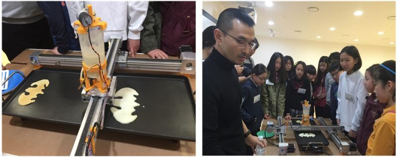 오늘 소개해주신 ‘팬케이크메이커‘는 3D프린터를 해킹하여 반죽용기와 펌프를 추가로 달아 자신이 원하는 팬케이크 모양으로 실현해주는 기계이다. 튜브베어링, 압축공기 등 조금은 생소한 용어가 나오긴 했으나 아이들은 신기한 듯 강의에 집중하는 모습이었다. 그 다음에는 전기포트를 해킹해서 만든 스테이크 굽는 기계, 커피 볶는 기계, 아이폰을 이용한 열 감지 카메라 등 다양한 해킹 사례를 사진과 동영상으로 설명해주셨다. 그중에서도 가장 기억에 남는 것은 병원에서 사용하는 링겔을 사용하여 더치커피를 만드는 것이었다. 이 기계는 1천원도 안 되는 가격에 만들 수 있다고 하셨는데, 그 기발한 아이디어에 절로 무릎이 쳐진다. 아이들도 스스럼없이 질문을 하며 해킹 속으로 빠져드는 모습이다. 김성수 아티스트는 하나의 작품이 완성되기까지 여러 번 실패하고, 계속하여 시도하는 끝에 어렵게 성공할 수 있다는 것을 아이들에게 알려주셨다. 아이들은 그 부분이 인상적이었으며 자신도 쉽게 포기하지 않고 끝까지 노력해보고 싶다는 생각이 들었다고 소감을 말해주기도 하였다.
