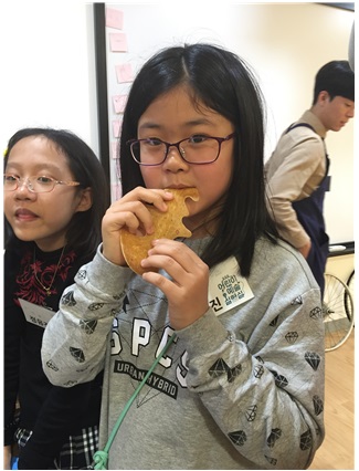 아이들은 자리에서 나와서 배트맨, 똥, 미키마우스 등 다양한 모양으로 팬케이크 반죽이 똑똑 떨어지는 모습을 지켜보았다. 익어가는 팬케이크 반죽과 더불어 맛있는 빵냄새도 공기를 타고 새어나간다. 다들 먹고 싶다며 기다리는 동시에 신기한 모습을 담고 싶다며 카메라로 촬영하는 친구들도 있었다. 수업이 끝난 뒤, 아이들에게 가장 기억에 남는 것이 무엇이냐고 묻자, 팬케이크를 만들었던 것이 가장 신기했다고들 답변했다.
