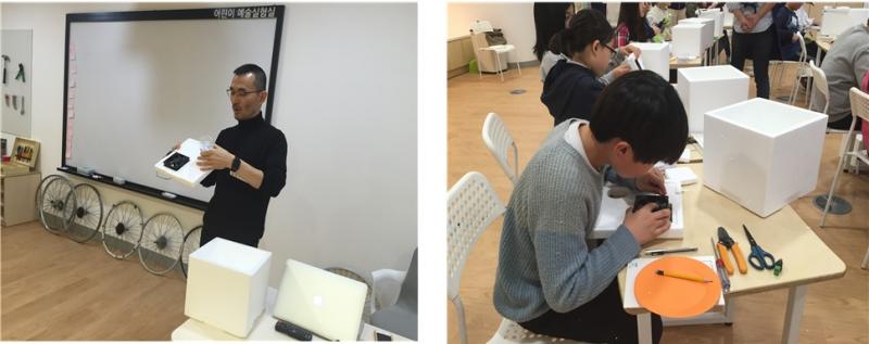 먼저, 김성수 아티스트의 소개로 수업은 시작되었다. 대전지역에서 이름하야 ‘무규칙이종결합공작터’라는 곳에서 해킹을 취미(?)로 하고 있으시고 본업은 제품개발자라는 김성수 아티스트는 자신이 지금까지 만든 여러 작품들을 아이들에게 보여주셨다.