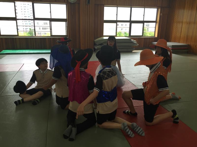 그 다음, 이번 시간 수업목표 설명이 이어졌다. 몬테고베 동작을 바탕으로 조별로 소품을 사용해 춤을 추는 창작 수업이었다. 몬테고베는 라인댄스의 기본동작중 하나로 외국 민속무용을 좀 더 재미있게 가르치기 위해 수업에 접목해보셨다고 한다. 라인댄스란 여러 사람이 줄을 지어 추는 춤으로, 특별한 파트너 없이 앞줄과 옆줄의 라인을 맞추어 추는 ‘선무‘라고 할 수 있다. 동작이 쉽고 따라 하기 쉬워 학생들도 좋아한다고. 오늘 수업 이전에는 무용의 기본스텝인 기본 걷기, 투스텝, 스키핑, 갤러핑 스텝을 다 같이 해보았단다. 그 다음 무대 공간 활용법을 알아보는 수업을 한다. 아이들이 다함께 움직이다가 갑자기 정지한 뒤, 비어있는 공간을 활용해보는 것이다. 무용 수업은 보통 한국무용, 외국 민속무용, 창작, 감상 분야로 나누어지는데 오늘은 16박 사이에 들어갈 춤을 직접 만드는 창작수업이다. 좀 더 구체적인 학습활동을 위해 강사께서는 조별 미션을 주셨다. 아이들은 무용 작품을 만들 때 각 조별로 □, △, ○, \ 모양의 대형이 들어가게 짜야한다. 이윽고 조별로 모여 다양한 아이디어를 내기 시작했다. 이런 동작, 저런 동작 함께 맞춰보며 진지하게 협의하는 모둠도 있고, 어떻게 시작할지 몰라 당황하고 있는 모둠도 있었다. 잘 안 되는 모둠에는 강사께서 팁을 주시며 함께 만들어보도록 격려하셨다.