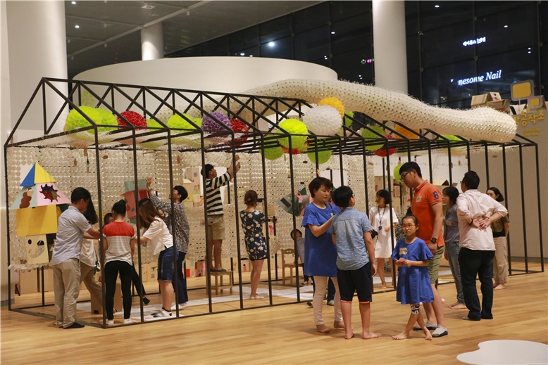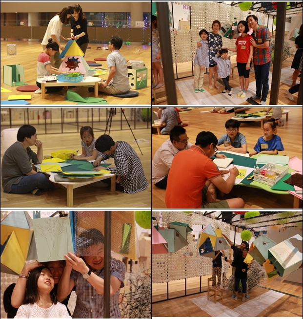 먼저 여섯 가족들에게 보조 선생님들 한분씩이 배정되어 함께 설계를 시작한다. 엄마, 아빠, 언니, 동생 온 가족은 모두 열심이다. 힘들지만 함께 하는 작업이여서인지 마냥 즐겁다. 다른 가족들은 무엇을 할까 살짝 엿 보기도 하면서 함박웃음을 짓는다. 엄마가 알록달록한 셀로판지를 오리고 아빠는 본드로 지붕을 붙이면 아이는 연필로 그림을 그린다. 처음 해 본 솜씨가 아닌 것처럼 능숙하다. 내공은 하루아침에 이루어지지 않는다. 내가 만든 공간을 우리 집으로 연결해 머리에 써 보고 와이어로 매달아야 하는 미션이다. 하트모양의 창문을 통해 바라보는 동네는 어떤 빛깔일까?