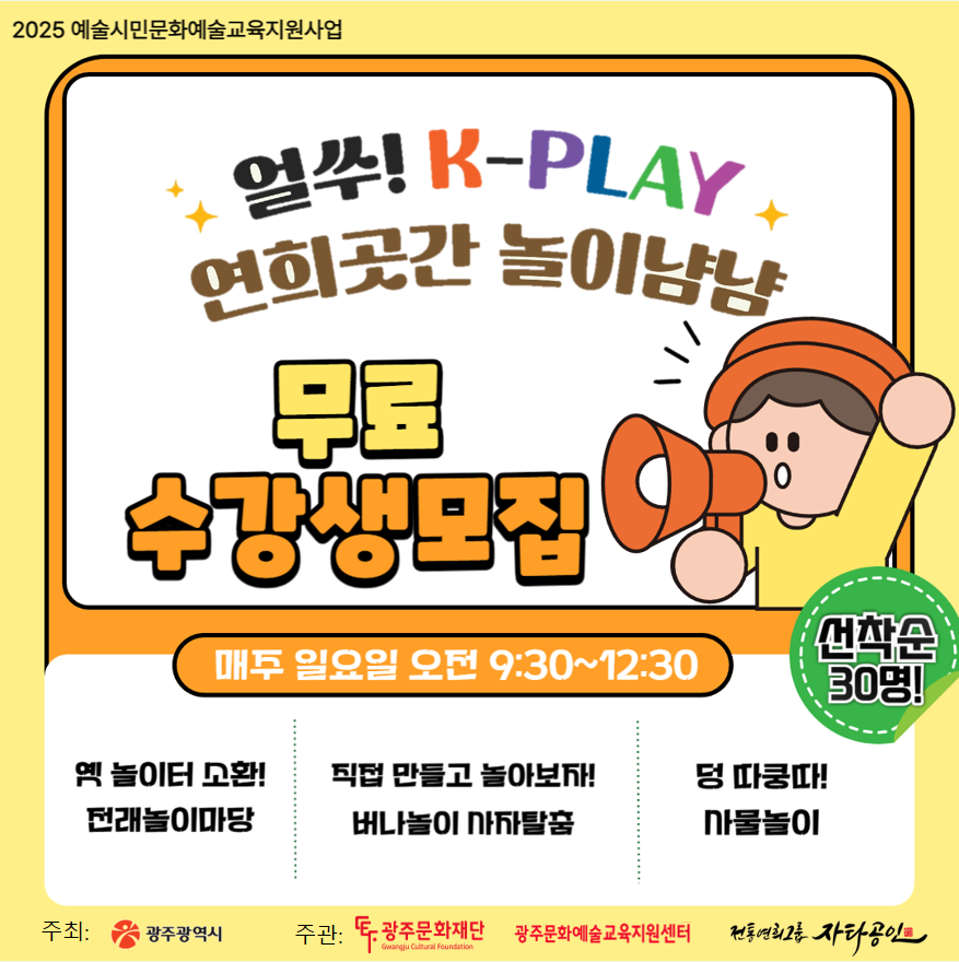 - 놀면서 배우는 우리 전통! 몸으로 즐기고, 마음으로 나누는 K-Play 예술교육✨ (1)옛 놀이터 소환 전래놀이마당! (2)직접 만들고 놀아보자-버나놀이,사자탈춤! (3)덩 따쿵따 사물놀이