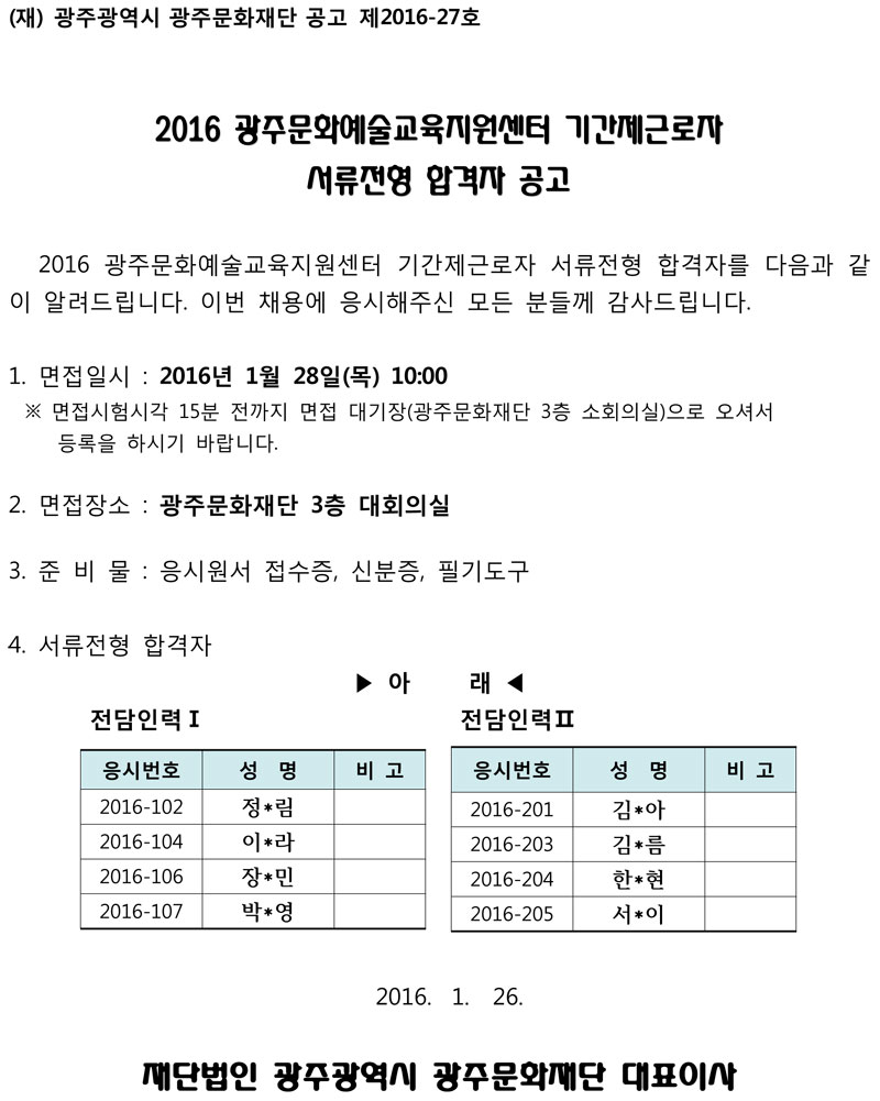 2016 광주문화예술교육지원센터 기간제 근로자 서류전형 합격자 공고