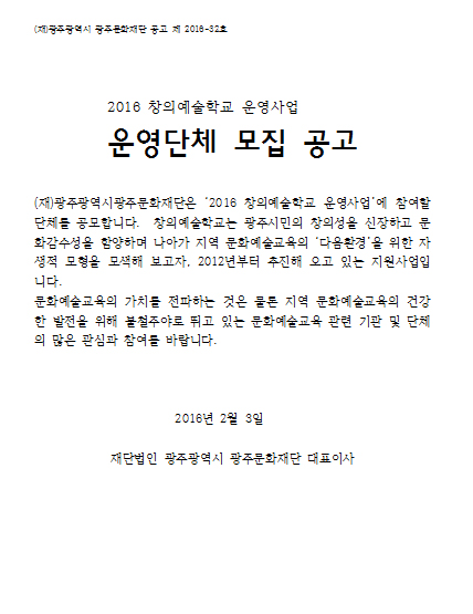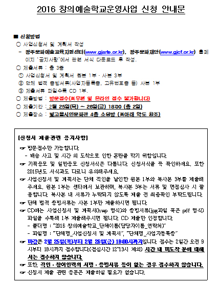 2016 창의예술학교 운영사업 운영단체 모집 공고